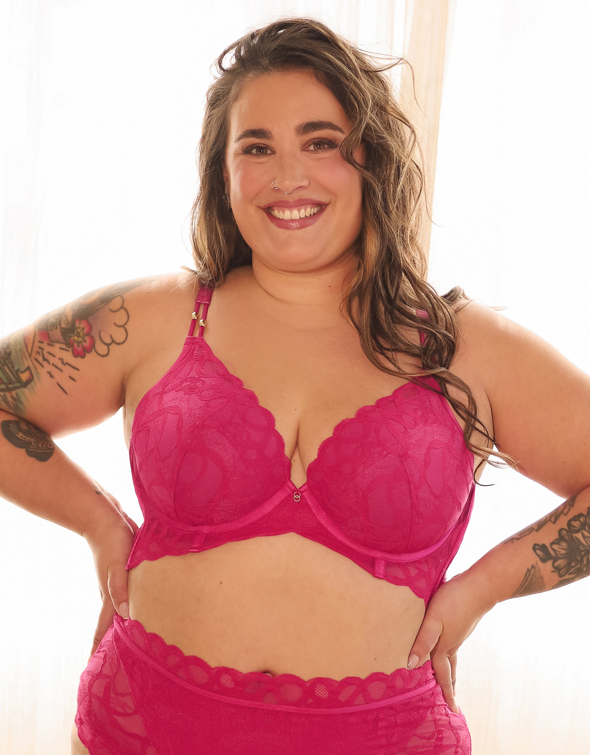 Der moderne Plunge-Schnitt betont Dein Dekolleté auf elegante Weise, während die grafische Spitze mit feiner Bogenspitze am Ausschnitt Deine Sinnlichkeit sanft unterstreicht. Goldene Details setzen luxuriöse Akzente, die Dich daran erinnern: Du verdienst es, Dich selbst zu feiern.