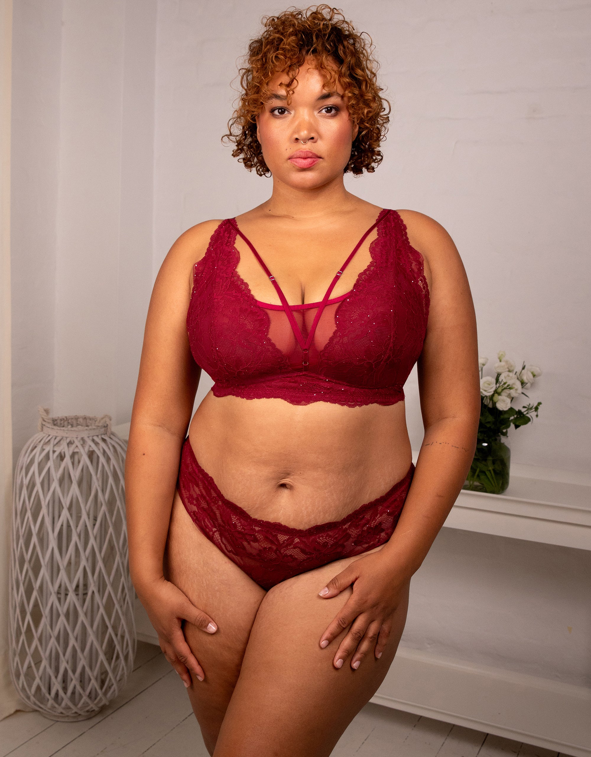 Mit diesem edlen Brazilian kann man nicht anders als zu strahlen! Zarte florale Spitze in tiefem Rot schmiegt sich sanft an die Haut, während feine Mini-Pailletten das Licht einfangen und für einen edlen Schimmer sorgen. Der Brazilian-Schnitt betont Deine Kurven auf natürliche Weise und sorgt für eine aufregende Silhouette.