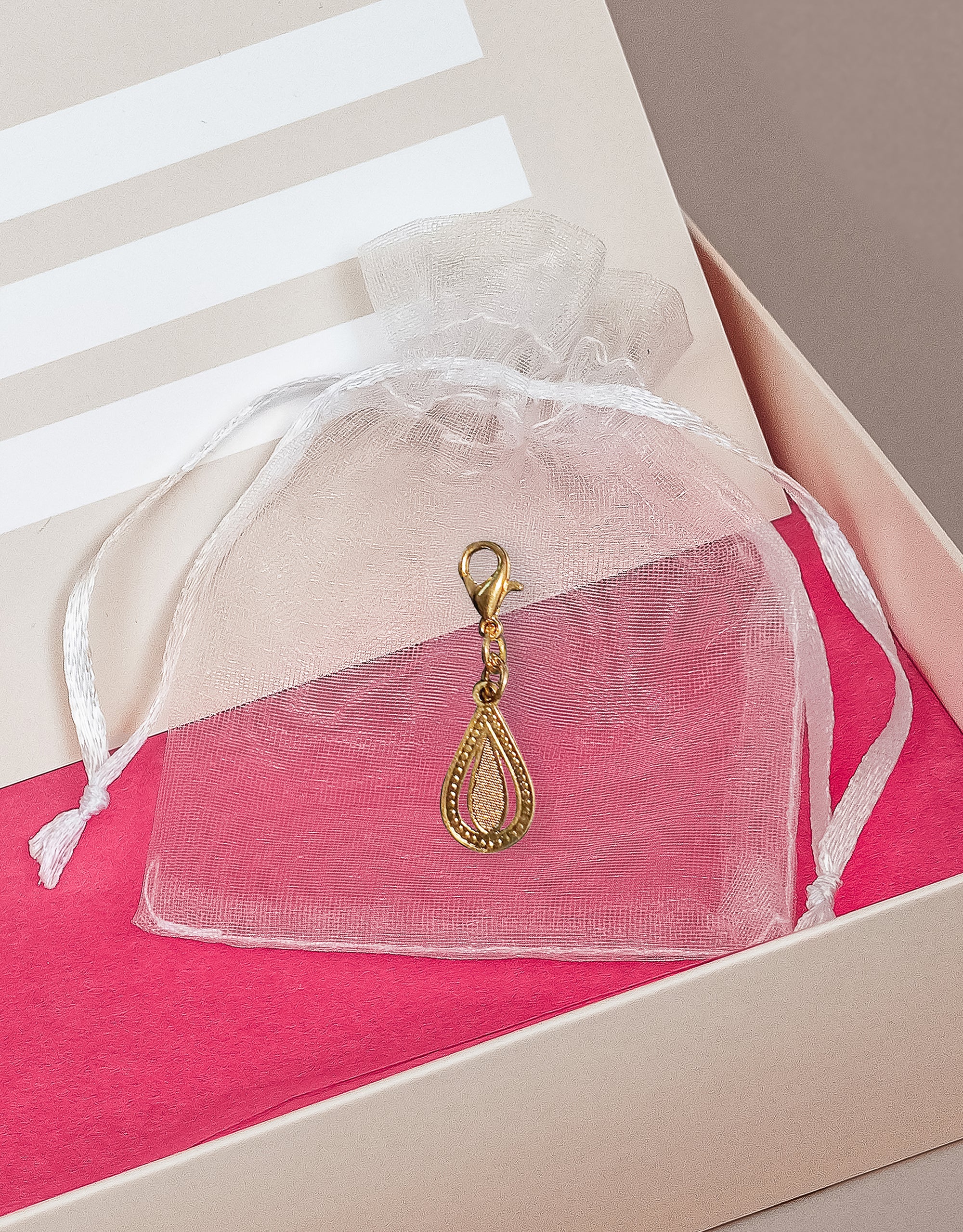 Neben dem Geschenk-Gutschein, dessen Wert Du (ab 25€) selbst wählen kannst, enthält das Paket den Bra-Charm "Persia" mit dem Du Dein Dekolleté zum Funkeln bringst (UVP 6,99€). Verschenke Freude an Deine Liebsten.